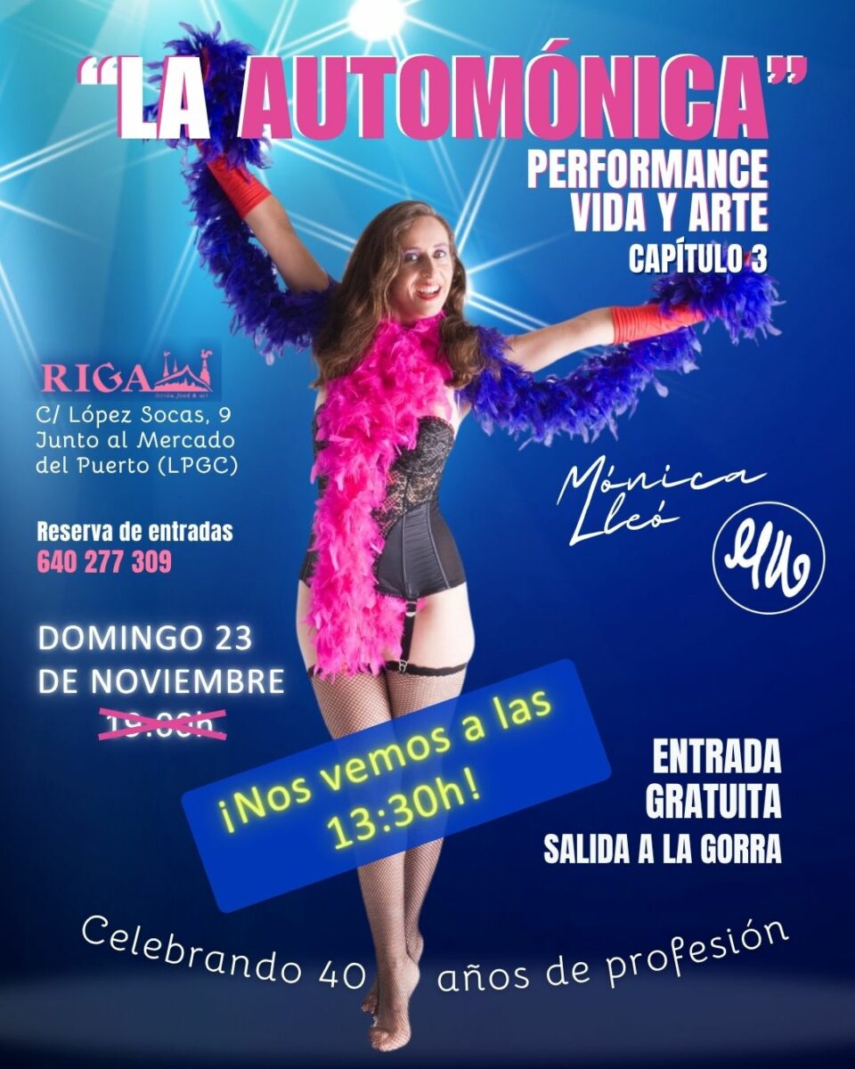 Mónica Lleó se sube de nuevo a las tablas del Riga Art Café con el Capítulo 3 de su ‘La Automónica – Performance, Vida y Arte’. El penúltimo de la serie creada para conmemorar sus 40 años como artista, en la que se sumerge en el diálogo entre su vida y su arte.